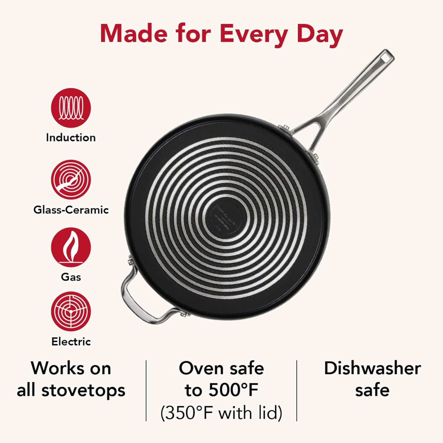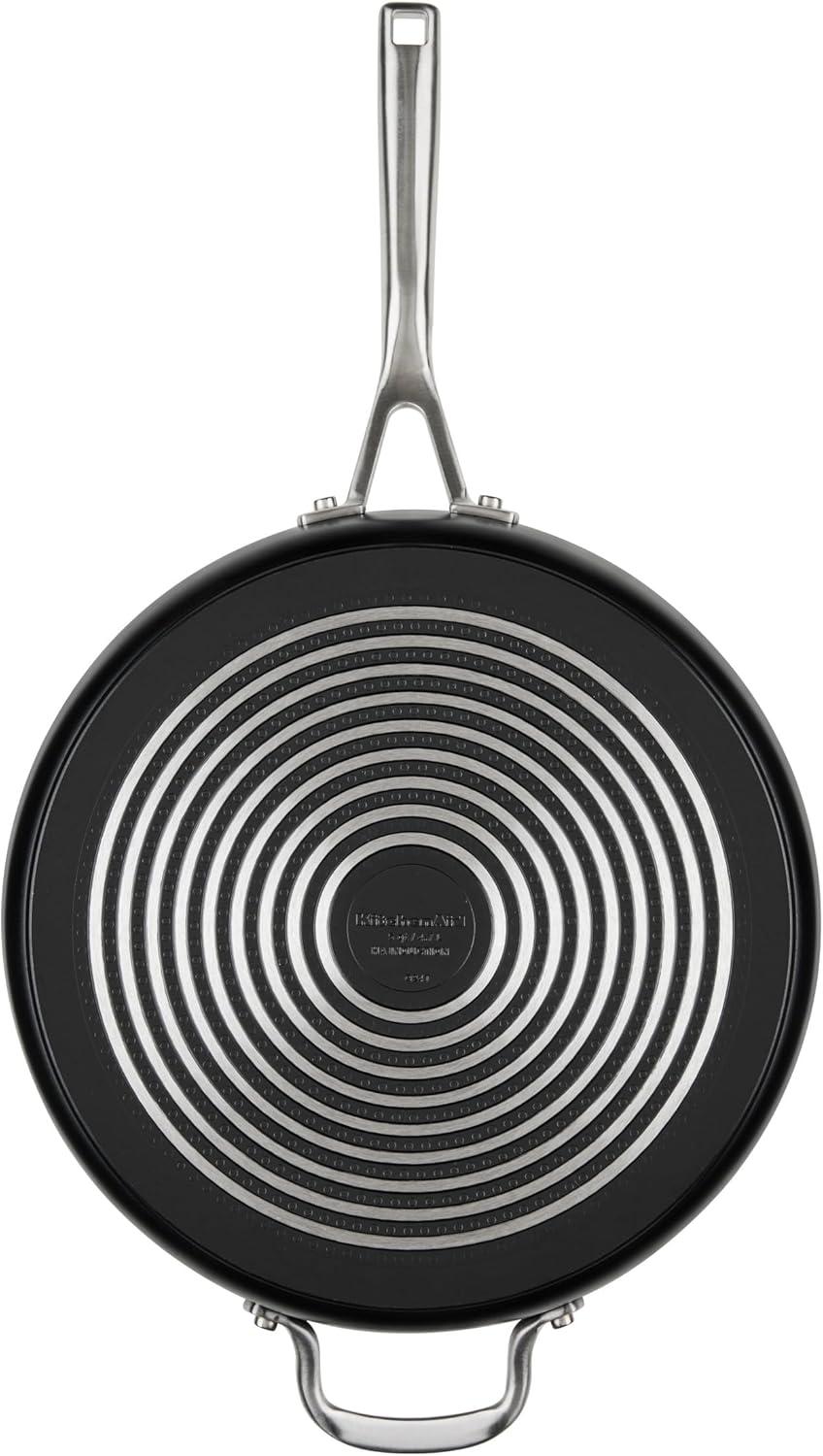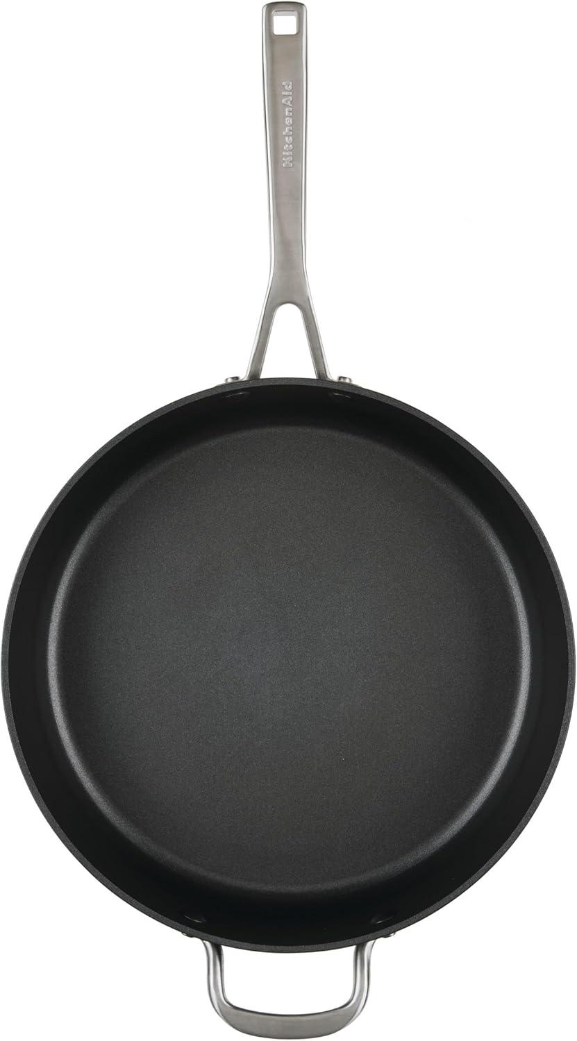 Take control with even heat and achieve consistent results when cooking with the KitchenAid Hard Anodized Induction Nonstick 5-Quart Sauté Pan with Lid. Crafted from durable hard-anodized aluminum-which is 8x harder than traditional aluminum-this premium sauté pan is built for inventive cooking and versatile enough for everyday use. Thick, forged base is designed to heat evenly, eliminating hot spots for beautifully browned results on any stovetop. Triple-layer nonstick on the cookware interior and handle rivets provides effortless food release for a completely nonstick cooking surface. Meet recipes head-on with an induction-compatible pan that is oven safe to 500°F, 350°F with lid. Dishwasher safe for easy cleaning.
